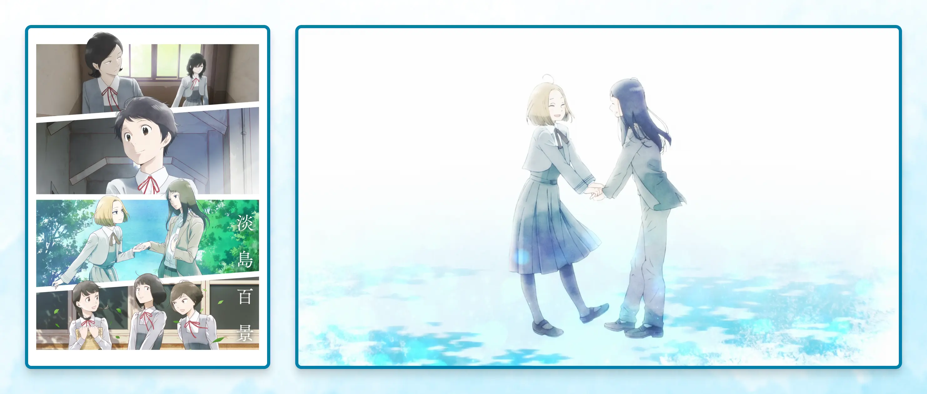 改编动画大体继承了《夏日重现》的班底,投入远长于普通季番的工期,尽可能呈现原著精髓,制作水准在本季度无出其右。导演渡边步和编剧濑古浩司强强联手,更请来贡献游戏神曲无数的前 FS 社作曲家北村友香,流动的光影衔接悠扬的配乐,挥洒堪称炫技的作画,勾勒立体书风格的转场,全片宛如动起来的绘本,每一幕都赏心悦目。